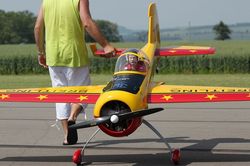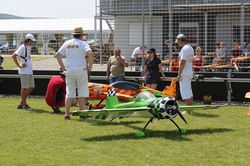 A teď už alespoň v krátkosti k reportáži. Soutěž se uskutečnila na nádherném letišti Czech Heaven a pořadatelem byl RC klub Brno. Majitel areálu, Honza Dašovský vybudoval opravdu výjimečný kompex s úrovní služeb, které nemají ve světě obdoby. I počasí báječně vyšlo a tak jsme mohli přivítat 6 pilotů SPORTSMAN a 7 pilotů F3M. Na poslední chvíli se omluvili Tomáš Babička (těsně před soutěží rozbil eroplán) a Jirka Mikeska, ten měl zdravotní problémy. Je výborné, že nás bylo víc než na první soutěži v Tachově. Bodování se zhostili zkušení bodovači Ondra Matula, Petr Bukovanský a zaskočit musel Ivoš Kryl jelikož domluvení bodovači ze Slovenska nemohli přijet. Ředitelem soutěže a motorem celé soutěže byl Laďa Ochotný, který s dalšími členy RC klubu Brno zajišťovali naprosto bezproblémový chod soutěže. Nejvíce potěšitelné je, že se nováčci zlepšují snad každým dnem! Výborně létají Daniel Krob, Jirka Hron a zdatně jim sekundují Aleš Myškeřík a mladý Jakub Nečesánek. Všichni jmenovaní až na Jakuba použili YAK55M 3m od Krill model. Jakub létá s elektrickým YAK55M o rozpětí 2.2m. Letěly se jako obvykle 2 povinné a Dan Krob, Jakub Nečesánek a Vladimír Ochotný letěli ještě volnou sestavu. Více se toho při jednodenní soutěži nedá stihnout. Hlavní kategorií bylo F3M. Tam stále dominuje Dan Hrachovec a na paty mu šlapou Matěj Šteigl a při neúčasti Jirky Mikesky i Martin Pasáček. Matěj s Martinem jsou tak vyrovnaní, že jejich výsledek po 1.povinné byl naprosto stejný počet bodů! Soutěže se zúčastnil i jeden pilot z Rakouska, Martin Brandmüler. Létal s YAK54 celodřevěné konstrukce o rozpětí 2.6m. Ostatní použili opět 3metrovky. Při tak těsném bodovém odstupu po povinných a tajných sestavách rozhodují volné sestavy. Na selhání, respektive uvolnění kabiny za letu u svého modelu YAK55M doplatil Martin Pasáček a jeho volná byla ohodnocena jen polovičním počtem bodů. Smůlu měl i Honza Hofman, kterému zhasnul motor MVVS 152 a sestavu nedokončil. Honza má obecně smůlu. Létá se dvěma eroplány, YAK55M od Krill model a KATANA S39% rovněž od Krill model. Je ale nějak nervózní a nedaří se mu letos, jak by si asi představoval. Matěj Šteigl zase výborně zvládá povinné a tajné sestavy, ale ztrácí ve volných. Rádia použili všichni na 2.4GHz a nebyl žádný problém. Roli zde hraje i fakt, že vybavení se používá to nejlepší co je na trhu. Nepřevažuje žádná značka, jsou k vidění GRAUPNER MC24, FUTABA FX30 a 40, SPEKTRUM. Moduly 2.4 se používáíj SPEKTRUM, FASST a JETI DUPLEX. Vše ve spojení s POWER BOXem, 1 nebo dvěma přijímači a digitálními servy a LiPo accu. Motory jsou DA150 a 170, 3W 157 a 170 a MVVS 152. V menších modelech jsou převážně motory DLE. Vrtule v drtivé většině MEJZLIK 29×12 třílist a 30×13 až 32×10 dvojlisté na volné sestavy.